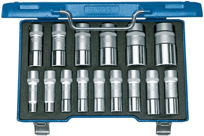 Inhalt: 15 Steckschlüssel-Einsätze, lang; 10; 12; 13; 14; 15; 16; 17; 18; 19; 21; 22; 24; 27; 30; 32 mm.
