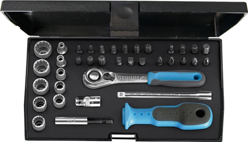 Steckschlüssel-Garnitur 1/4", Nr. D 20 KMU-20• Matt verchromt • Chrom-Vanadium-Stahl 31CrV3 Lieferung: Im Kunststoffkasten, inklusive Check-Tool-Einlage. Inhalt: 1 Hebel-Umschaltknarre 10 12-k