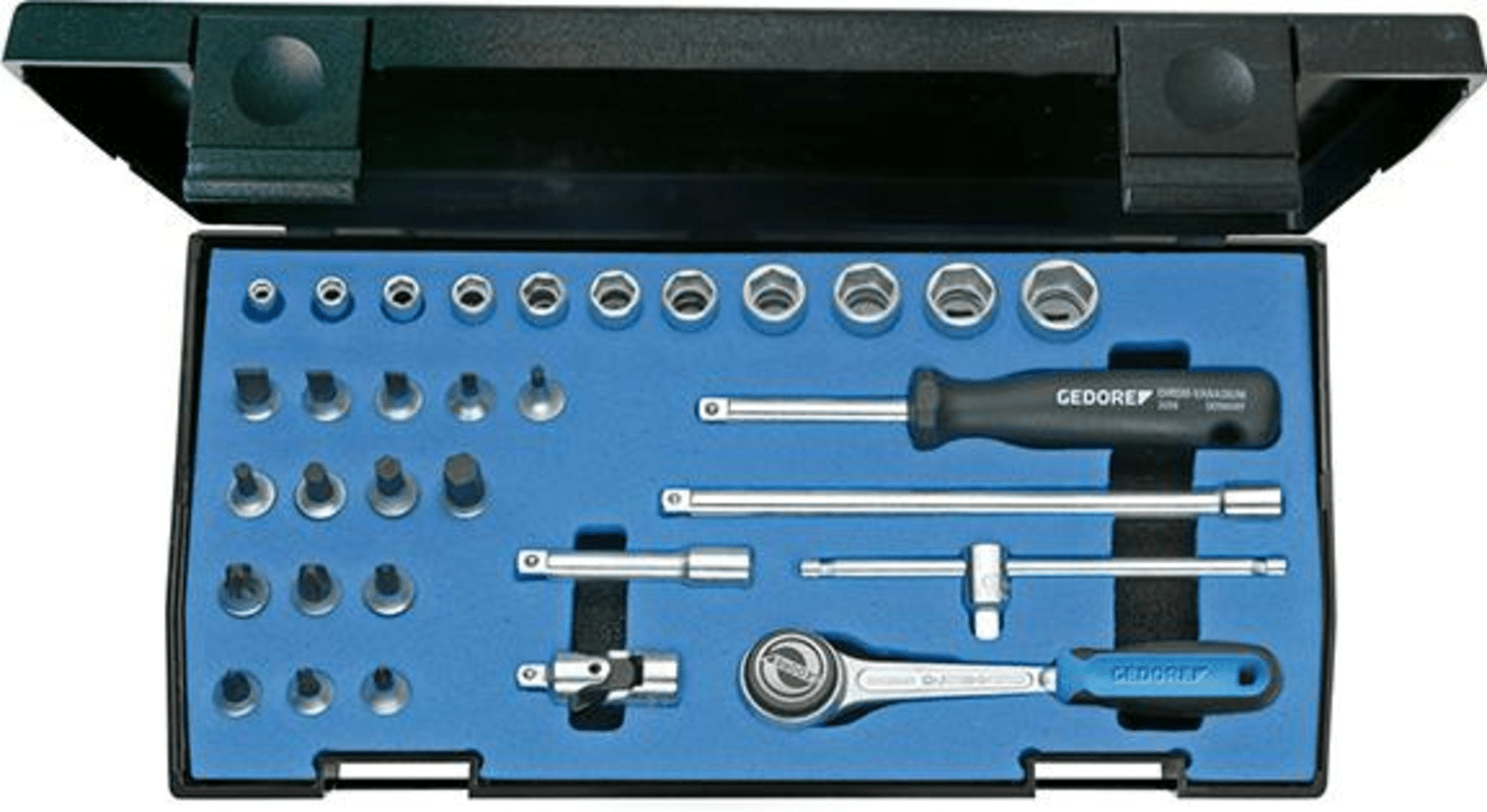 Steckschlüssel-Garnitur 1/4", Nr. 20 IMU-3• Matt verchromt • Chrom-Vanadium-Stahl 31CrV3 Lieferung: Im Kunststoffkasten, inklusive Check-Tool-Einlage. Inhalt: 1 Umschaltknarre 11 6-kant-Stecksc