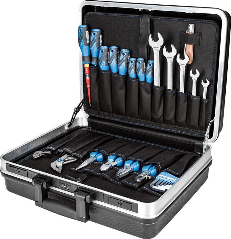 Werkzeugsortiment Nr. 1041-001Lieferung: Stabiler Hartschalenkoffer aus schlagfestem ABS-Kunststoff mit robustem Rahmen aus Aluminium Inhalt: 5 Ring-Maulschlüssel 10; 13; 17; 19; 22 mm 1 Hebe