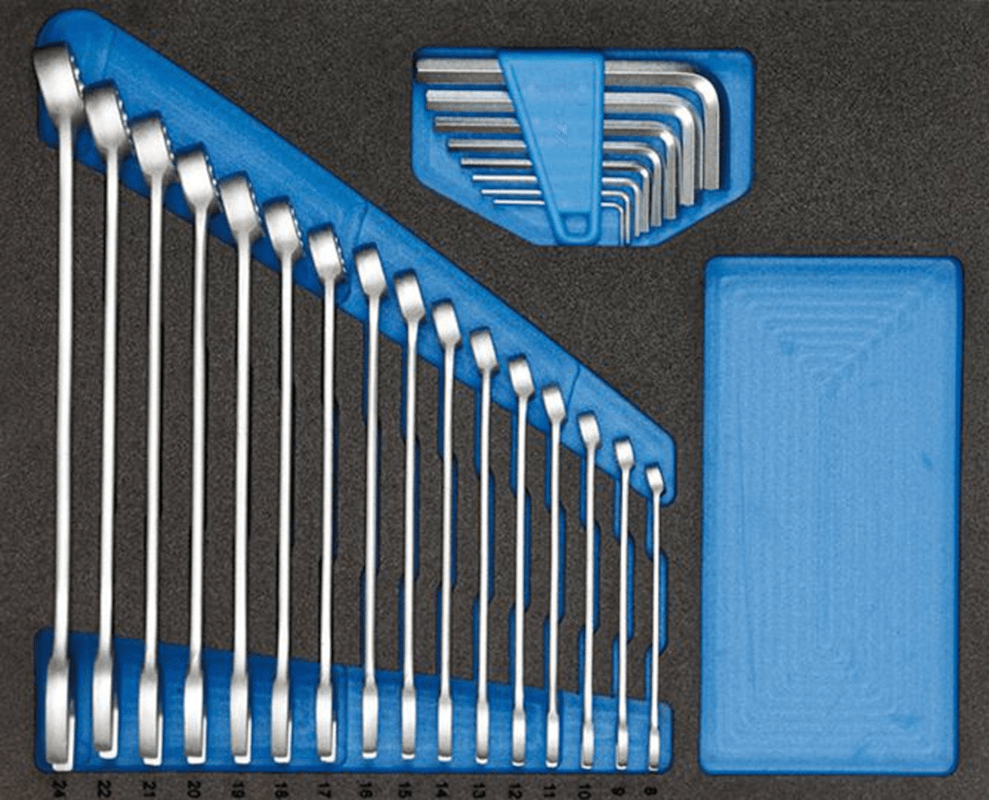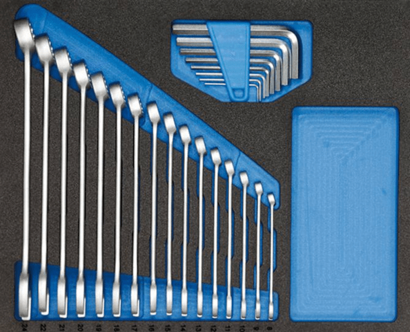 Jedes Werkzeug liegt verrutschsicher in eigener Aussparung, durch Griffmulden leicht herausnehmbar