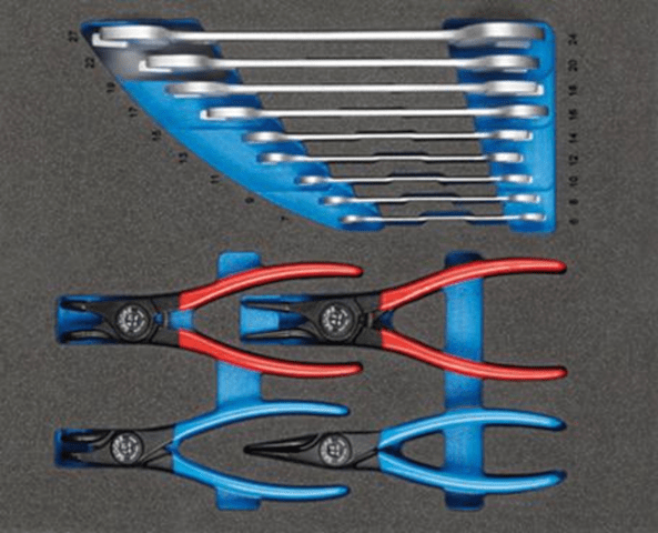 Jedes Werkzeug liegt verrutschsicher in eigener Aussparung, durch Griffmulden leicht herausnehmbar