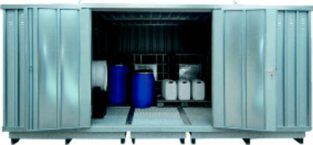 Sicherheitslagerhaus • Lagerhaus: Stahlblech, verzinkt, Auffangwanne feuerverzinkt • Gitterrostauflage: Stahlblech, verzinkt • Oberfläche: verzinkt oder RAL 5015 himmelblau • Tür: 2-flügelig • Schlie