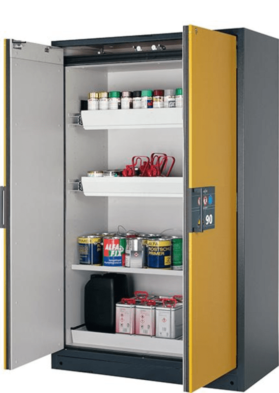 Gefahrstoffschrank Q-CLASSIC-90, mit 4 Auszugswannen • Außenkorpus: aus kunststoffbeschichtetem Feinstahlblech • Innenkorpus: aus chemisch-resistenten Spezialplatten • Struktur-Pulverbeschichtung: Korpus RAL 7016 anthrazit, Türen in RAL 1004 goldgelb • Brandschutzdämmung: mit hochwertigen Fugendichtungen • Türen: bleiben in jedem Öffnungswinkel stehen, selbsttätige Schließung im Brandfall, abschließbar mit Profilzylinder (schließanlagenfähig) und Schließ-Zustandsanzeige (rot/grün) • Erdungsanschluss: im Dachbereich • Sicherheitselemente korrosionsgeschützt außerhalb des Lagerraums montiert • Transport: integrierter Transportsockel mit abnehmbarer, optionaler Sockelblende • Aufstellung: Justiervorrichtungen zum Ausgleich von Bodenunebenheiten • Sicherheit: Feuerwiderstandsfähigkeit 90 Minuten, typgeprüft, GS-geprüft • Kennzeichnung: gemäß DIN EN 14470-1 Lieferung: Schrank mit 4 Auszugswannen inklusive Bodenauffangwanne gem. StawaR. Hinweis: Zur sicheren Lagerung von Gefahrstoffen in Arbeitsräumen gemäß DIN EN 14470-1 und TRGS 510.