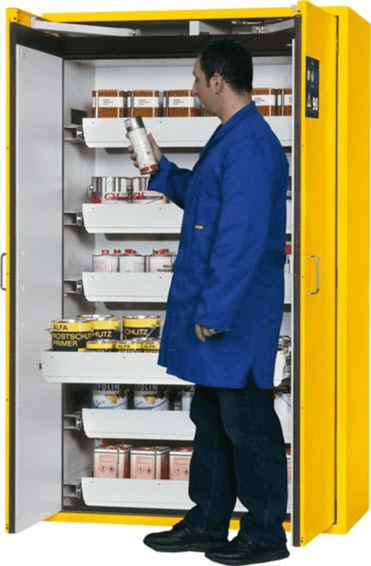 Gefahrstoffschrank S-Classic-90, mit 6 Auszugswannen • Außenkorpus: aus kunststoffbeschichtetem Feinstahlblech • Innenkorpus: aus chemisch-resistenten Spezialplatten • Brandschutzdämmung: mit hochwertigen Fugendichtungen • Türen: arretieren in der serienmäßigen Türfeststellanlage, sicheres Ein-/Auslagern der Gebinde. Türen abschließbar mit Profilzylinder (schließanlagenfähig) • Erdungsanschluss: im Dachbereich • Sicherheitselemente korrosionsgeschützt außerhalb des Lagerraums montiert • Aufstellung: Justiervorrichtungen zum Ausgleich von Bodenunebenheiten • Sicherheit: Feuerwiderstandsfähigkeit 90 Minuten, typgeprüft, GS-geprüft • Kennzeichnung: gemäß DIN EN 14470-1 Lieferung: Schrank mit 6 Auszugswannen inklusive Bodenauffangwanne gem. StawaR. Hinweis: Zur sicheren Lagerung von Gefahrstoffen in Arbeitsräumen gemäß DIN EN 14470-1 und TRGS 510.