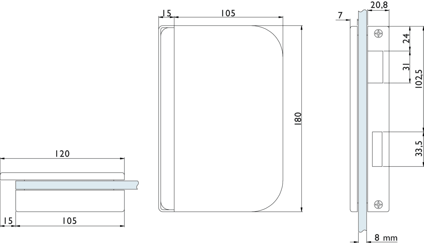 Glastür-Gegenkasten 6034 GKP - Roma, DIN rechts, mit durchgehender Anschlagplatte, Oberfl. F1 (silberfarben eloxiert)