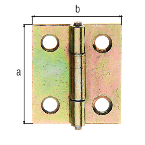 GAH Alberts Scharnier; Material: Stahl; Form: kantig,schmal; Oberfläche: sendzimirverzinkt; Befestigungsart: zum Anschrauben; Einsatzbereich: Tür; Basis: Scharnier; Ausführung: mit vernietetem Edelstahlstift,gerollt; Lochdurchmesser: 3,7 mm; Form Ecken: kantig; Höhe: 51 mm; Breite: 30 mm; Stärke: 0,75 mm; Farbe: gelb; Anzahl Schraublöcher: 4 St.; Schraublochausführung: Senkkopf; DIN-Richtung: DIN Links-Rechts