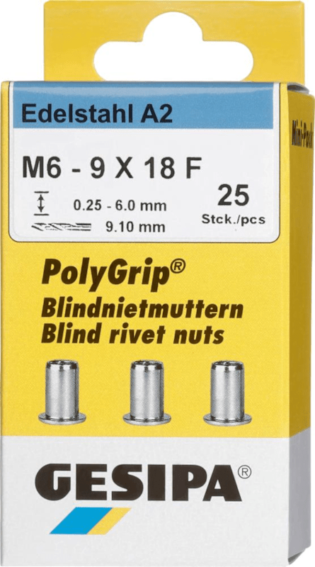 Meesenburg Artikelbezeichnung: GESIPA BLINDNIETMUTTER EDEL A2 MINIPACK POLYGRIP M6 9X18MM 25 ER PACK 1464838