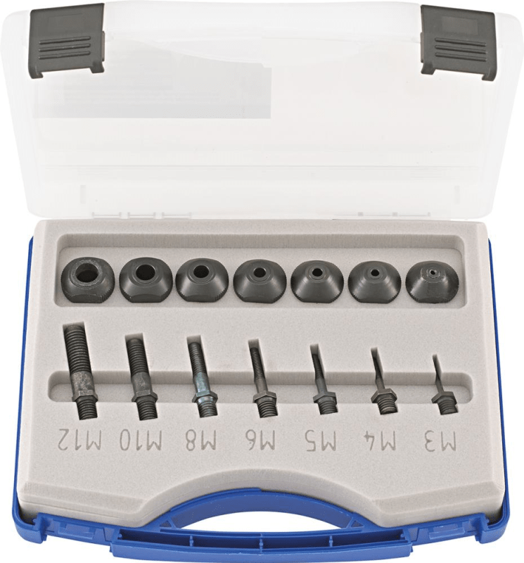 Lieferung: Im Kunststoffkoffer, mit je 1 Gewindedorn und 1 Mundstück M3; M4; M5; M6; M8; M10; M12.