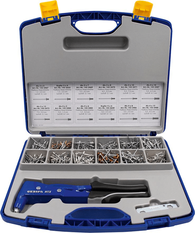 Blindniet-Garnitur Nietbox NTX• Arbeitsbereich bis 5 mm Ø Alu und bis 4 mm Ø Stahl und Edelstahl • Zangengehäuse aus Aluminium-Druckguss • Kunststoff-Stulpgriffe • Stahl-Zangenschenkel aus Chrom-Va