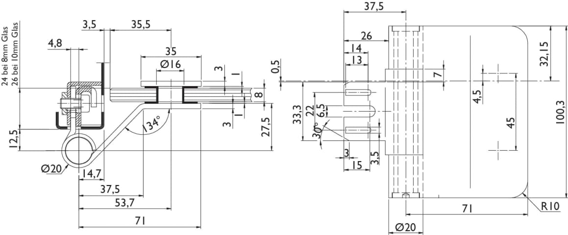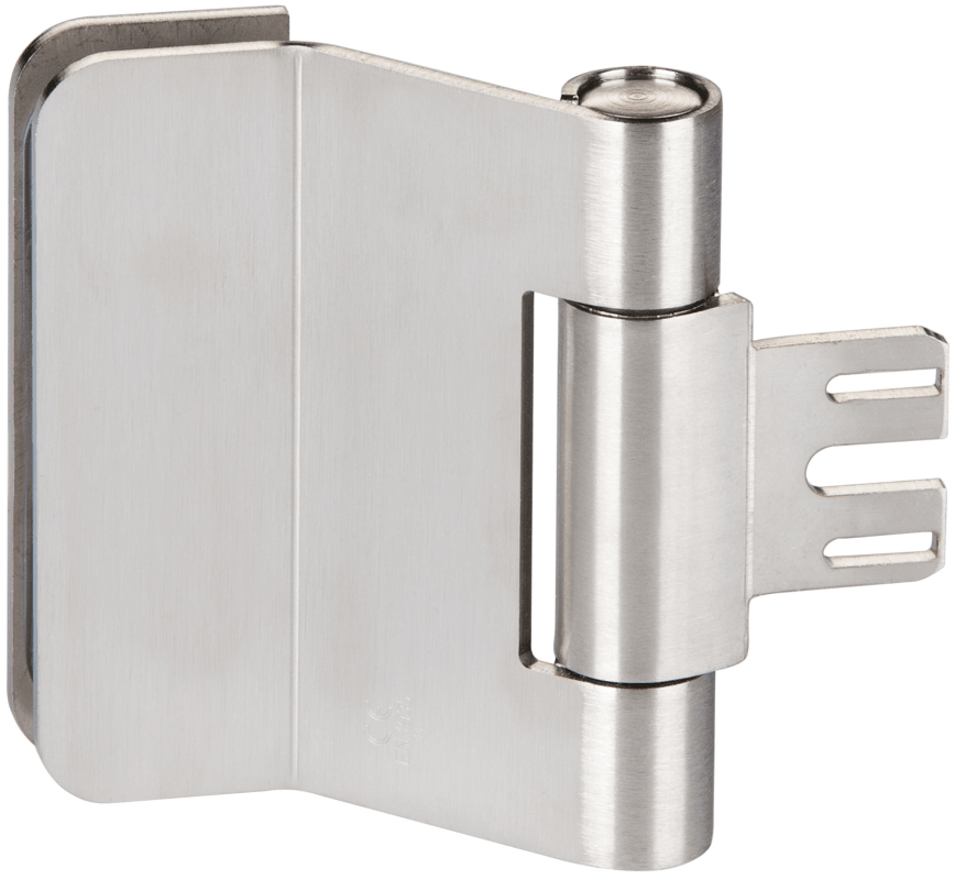 Glastür-Bandpaar 6350, 3 tlg. (Officebohrung) inkl. Rahmenteil Stahlzarge, für gefälzte Türen DIN RECHTS / Falztiefe 24 mm, max. empfohlene Türbreite 1000 mm, Oberfl. 60 (Edelstahl matt)