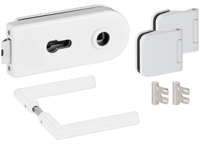 Glastür-Schlosskasten 6013 PZ - Venezia, PZ gelocht, inkl. Bandpaar 6315-41+Rahmenteil Stahlzarge, und Drückerpaar 1802-41, Oberfl. 41 (weiß ähnlich RAL 9016)