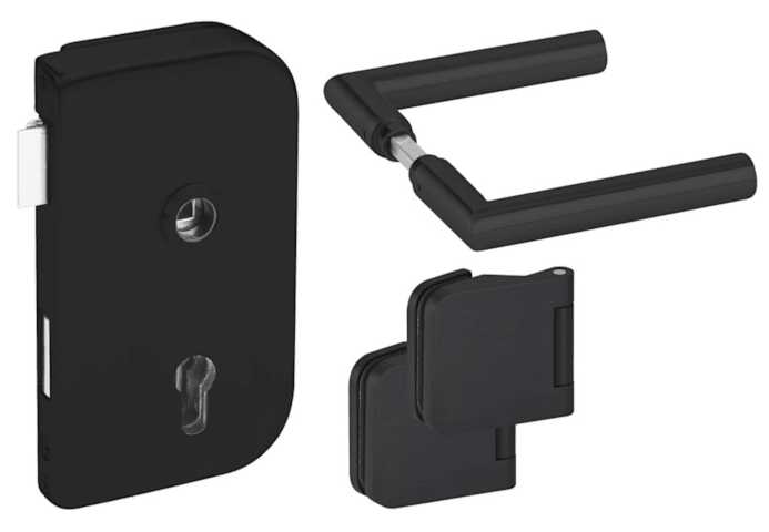 Glastür-Schlosskasten 6033 PZ - Roma, PZ gelocht - DIN rechts, inkl. Bandpaar 6315, und Drückerpaar 1802, Oberfl. 74 (Classic black, ähnl. RAL 9005)