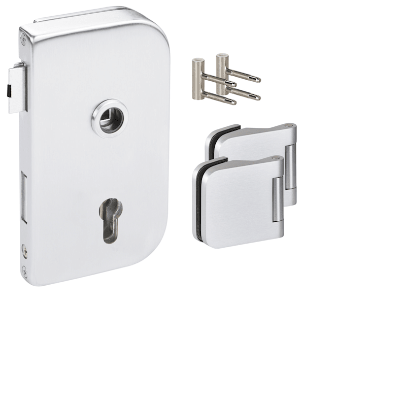 Glastür-Schlosskasten 6033 PZ - Roma, PZ gelocht - DIN links, inkl. Bandpaar 6315 & Rahment. Holzzarge, Oberfl. F1 (silberfarben eloxiert)
