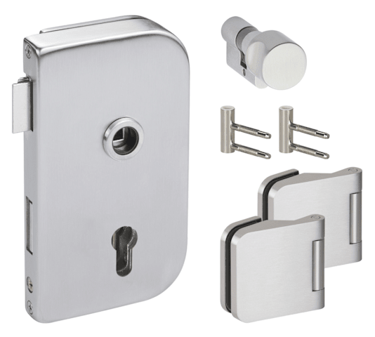 Glastür-Schlosskasten 6033 PZ - Roma, PZ gelocht - DIN links inkl. Knaufzyl. 6890SLS, inkl. Bandpaar 6315-20 & Rahment. Holzzarge, Oberfl. 20 (Edelstahlfarben)