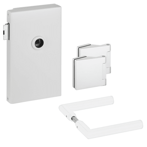 Glastür-Schlosskasten 6051 OL - Molina, ohne Lochung - DIN rechts, inkl. Bandpaar 6325, und Drückerpaar 1802, Oberfl. 41 (weiß ähnlich RAL 9016)