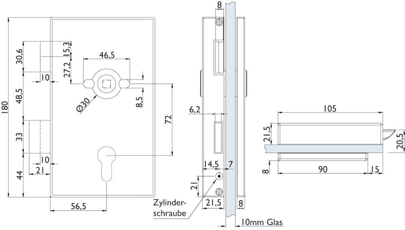 Glastür-Schlosskasten 6053 PZ - Molina, PZ gelocht - DIN links, Falle und Riegel für 10 mm Glas, Oberfl. 60 (Edelstahl matt)