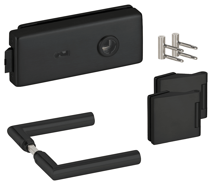 Glastür-Schlosskasten 6082 BB - Genova, Buntbart gelocht (inkl. 1 Schlüssel), inkl. Bandpaar 6325 & Rahment. Holzzarge, und Drückerpaar 1802, Oberfl. 74 (Classic Black, ähnl. RAL 9005)