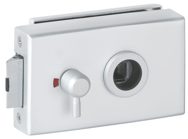 Glastür-Schlosskasten 6096 BAD - Arco, DIN links einwärts - mit rot/weiß Anzeige, Verriegelungshebel auf Schlossseite, Oberfl. F1 (silberfarben eloxiert)