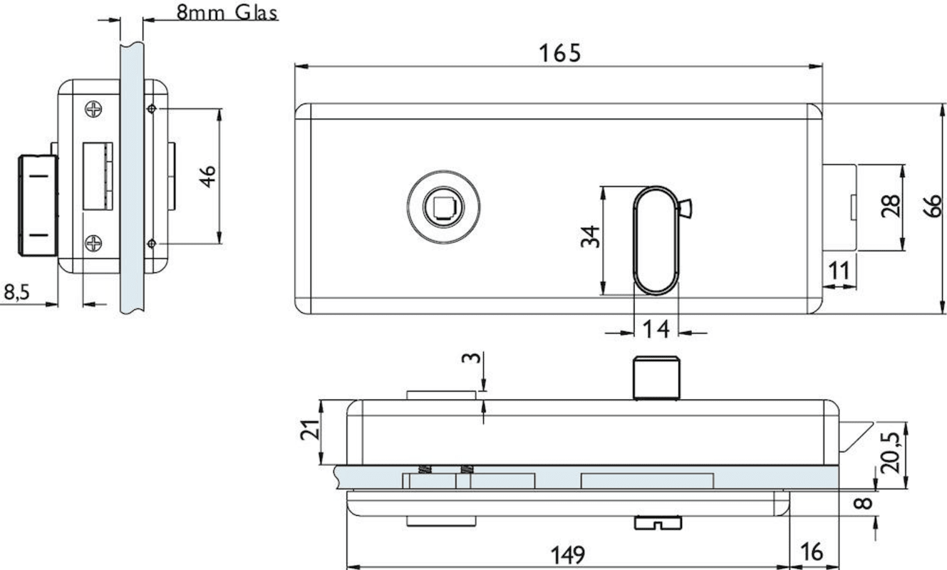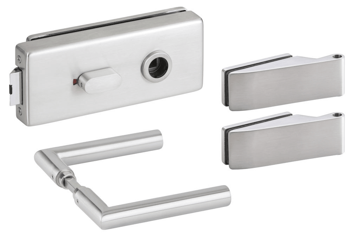 Glastür-Schlosskasten 6086 BAD - Genova, Verstellbar Universell Ls/Rs-mit rot/weiß Anzeige, inkl. Bandpaar 6225, und Drückerpaar 1802-60, Oberfl. 60 (Edelstahl matt)