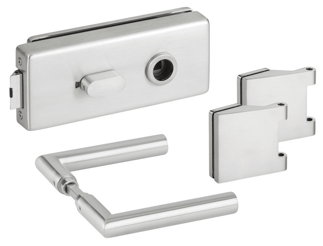 Glastür-Schlosskasten 6086 BAD - Genova, Verstellbar Universell Ls/Rs-mit rot/weiß Anzeige, inkl. Bandpaar 6325-20, und Drückerpaar 1802-60, Oberfl. 20 (Edelstahlfarben)