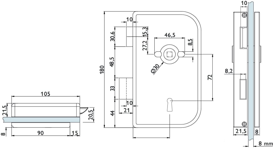 Glastür-Schlosskasten 6032-R BB - Roma, Buntbart gelocht (inkl. 1 Schlüssel) - DIN rechts, vorgerichtet für Drückerrosetten, Oberfl. F1 (silberfarben eloxiert)