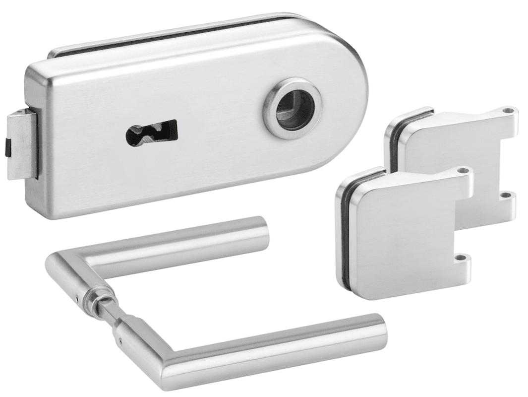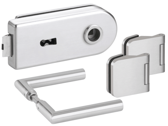 Glastür-Schlosskasten 6012 BB - Venezia, Buntbart gelocht (inkl. 1 Schlüssel), inkl. Bandpaar 6315.P, und Drückerpaar 1802-60, Oberfl. 60 (Edelstahl matt)