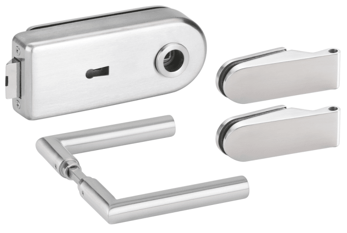 Glastür-Schlosskasten 6762 L BB - BASIC Round, Buntbart gelocht (inkl. 1 Schlüssel), inkl. Bandpaar 6215-20, und Drückerpaar 1802-60, Oberfl. 20 (Edelstahlfarben)
