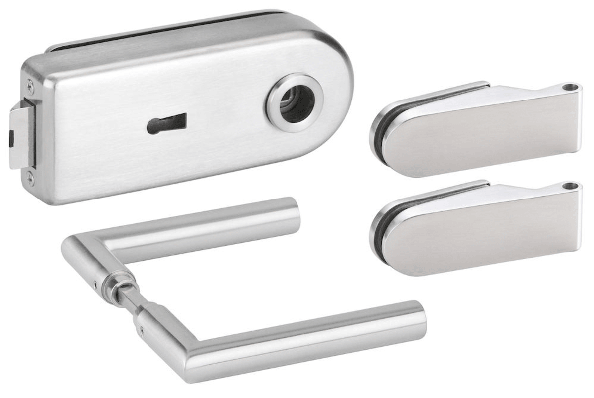 Glastür-Schlosskasten 6762 L BB - BASIC Round, Buntbart gelocht (inkl. 1 Schlüssel), inkl. Bandpaar 6215, und Drückerpaar 1802-60, Oberfl. 60 (Edelstahl matt)