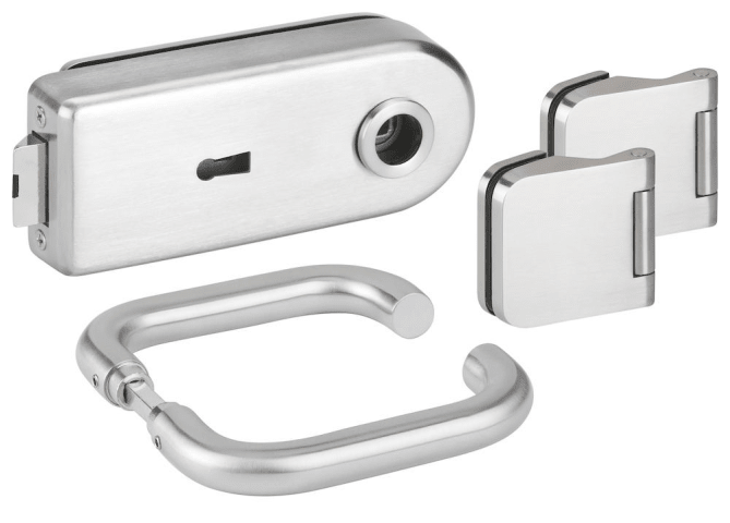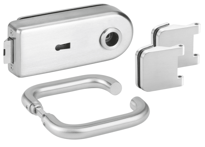 Glastür-Schlosskasten 6762 L BB - BASIC Round, Buntbart gelocht (inkl. 1 Schlüssel), inkl. Bandpaar 6315.P, und Drückerpaar 1801-60, Oberfl. 60 (Edelstahl matt)