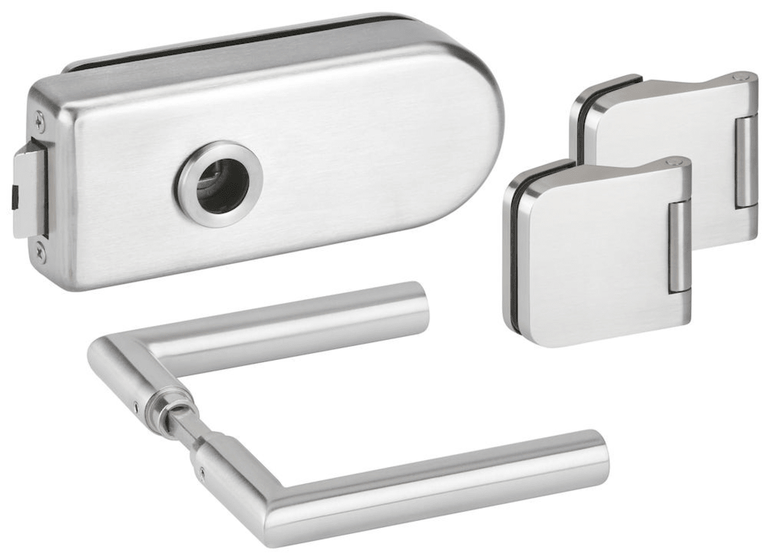 Glastür-Schlosskasten 6761 L OL - BASIC Round, ohne Lochung, inkl. Bandpaar 6315, und Drückerpaar 1802-60, Oberfl. 60 (Edelstahl matt)