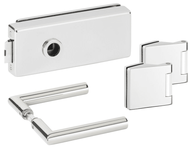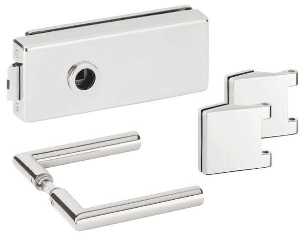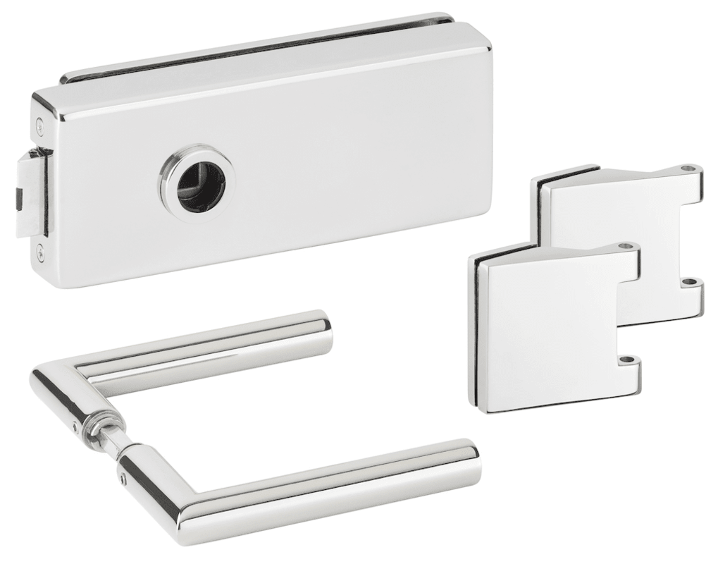 Glastür-Schlosskasten 6081 OL - Genova, ohne Lochung, inkl. Bandpaar 6325, und Drückerpaar 1802-61, Oberfl. 61 (Edelstahl poliert)