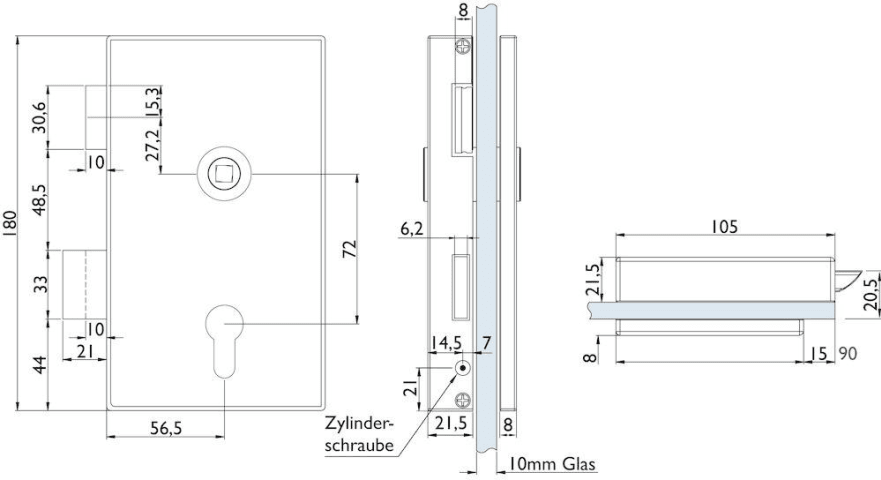 Glastür-Schlosskasten 6051 OL - Molina, ohne Lochung - DIN rechts, Falle für 10 mm Glas, Oberfl. 60 (Edelstahl matt)