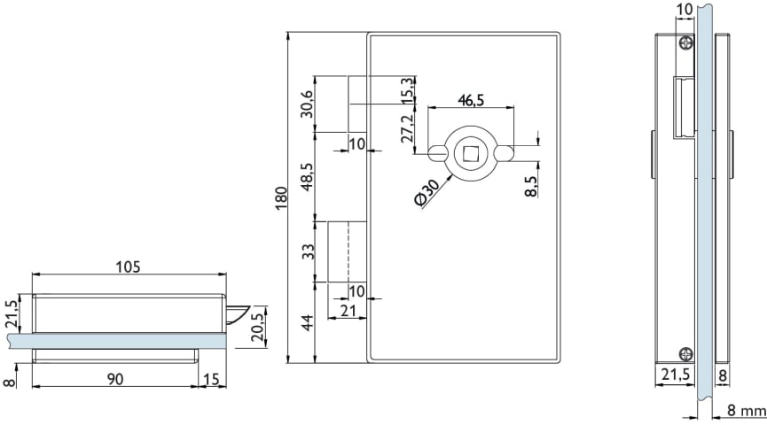 Glastür-Schlosskasten 6051-R OL - Molina, ohne Lochung - DIN rechts, vorgerichtet für Drückerrosetten, Oberfl. 60 (Edelstahl matt)
