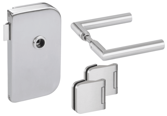 Glastür-Schlosskasten 6031 OL - Roma, ohne Lochung - DIN links, inkl. Bandpaar 6315-20, und Drückerpaar 1802-60, Oberfl. 20 (Edelstahlfarben)