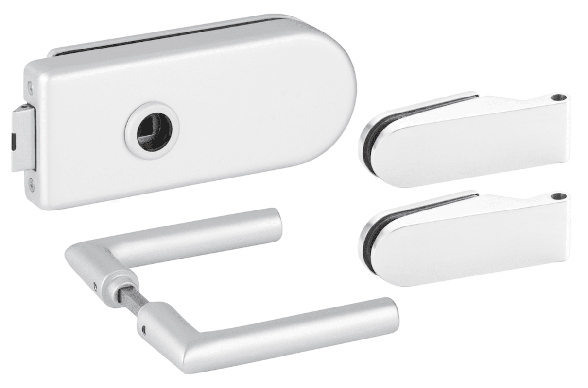 Glastür-Schlosskasten 6011 OL - Venezia, ohne Lochung, inkl. Bandpaar 6215, und Drückerpaar 1902.AL-F1, Oberfl. F1 (silberfarben eloxiert)