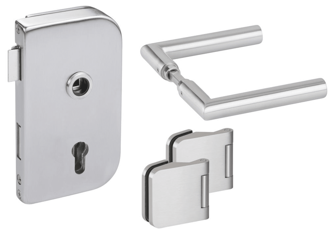 Glastür-Schlosskasten 6033/10 mm PZ - Roma, PZ gelocht - DIN links, inkl. Bandpaar 6315-20, und Drückerpaar 1802-60, Oberfl. 20 (Edelstahlfarben)