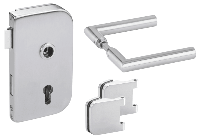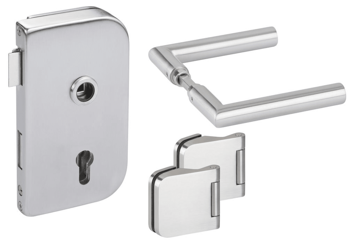 Glastür-Schlosskasten 6033/10 mm PZ - Roma, PZ gelocht - DIN rechts, inkl. Bandpaar 6315, und Drückerpaar 1802-60, Oberfl. 60 (Edelstahl matt)