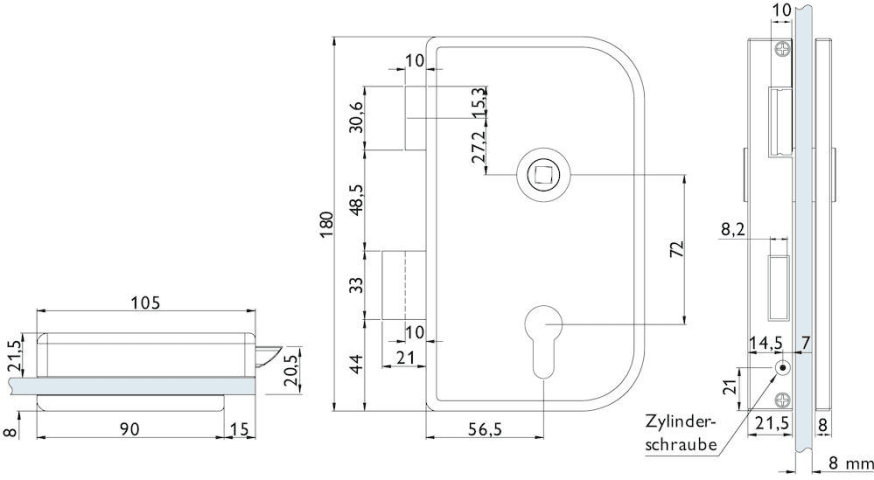 Glastür-Schlosskasten 6033 PZ - Roma, PZ gelocht - DIN rechts, inkl. Bandpaar 6315, Oberfl. 60 (Edelstahl matt)