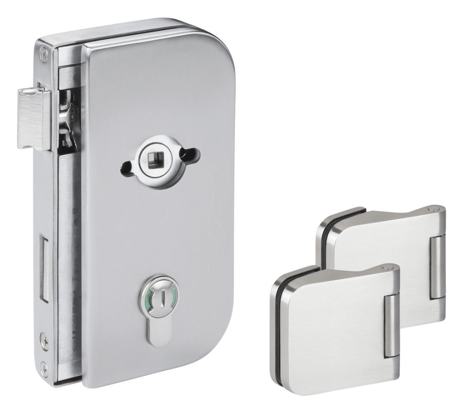 Glastür-Schlosskasten 6036-R BAD - Roma, mit Bad Verriegelung rot/grün - DIN links, inkl. Bandpaar 6315.P, vorgerichtet für Drückerrosetten, Oberfl. 60 (Edelstahl matt)