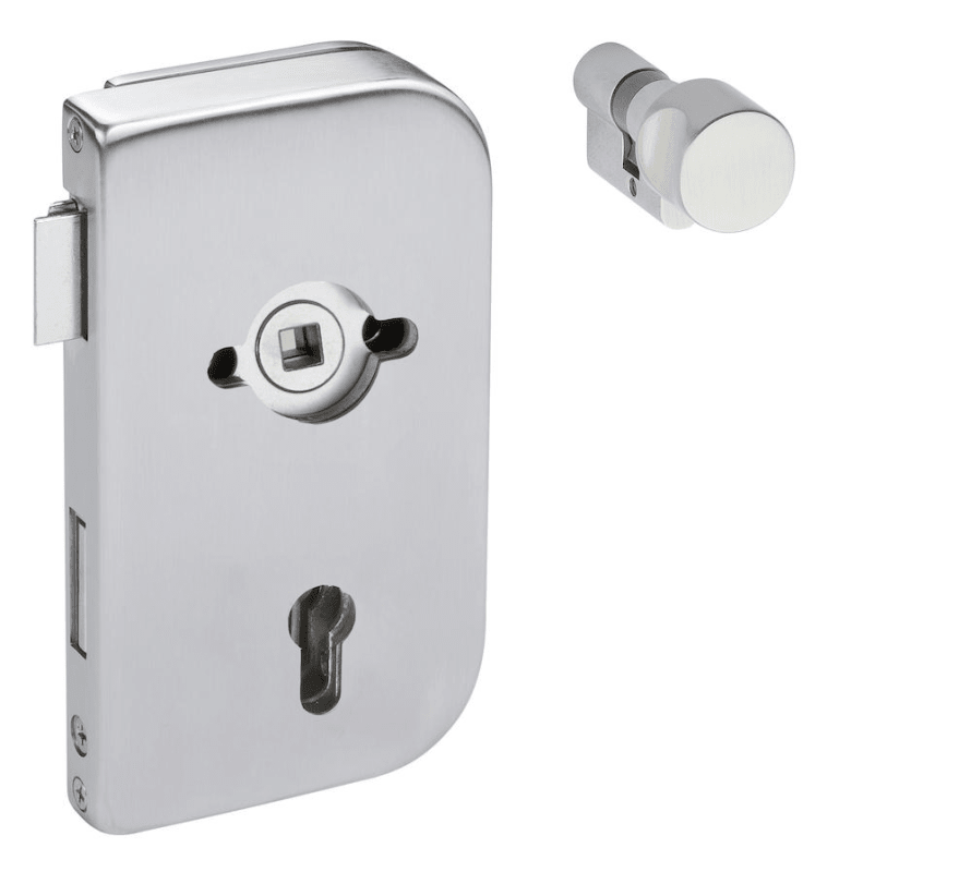Glastür-Schlosskasten 6033-R PZ - Roma, PZ gelocht - DIN rechts inkl. Knaufzyl. 6891SGS, vorgerichtet für Drückerrosetten, Falle und Riegel für 10 mm Glas, Oberfl. 20 (Edelstahlfarben)