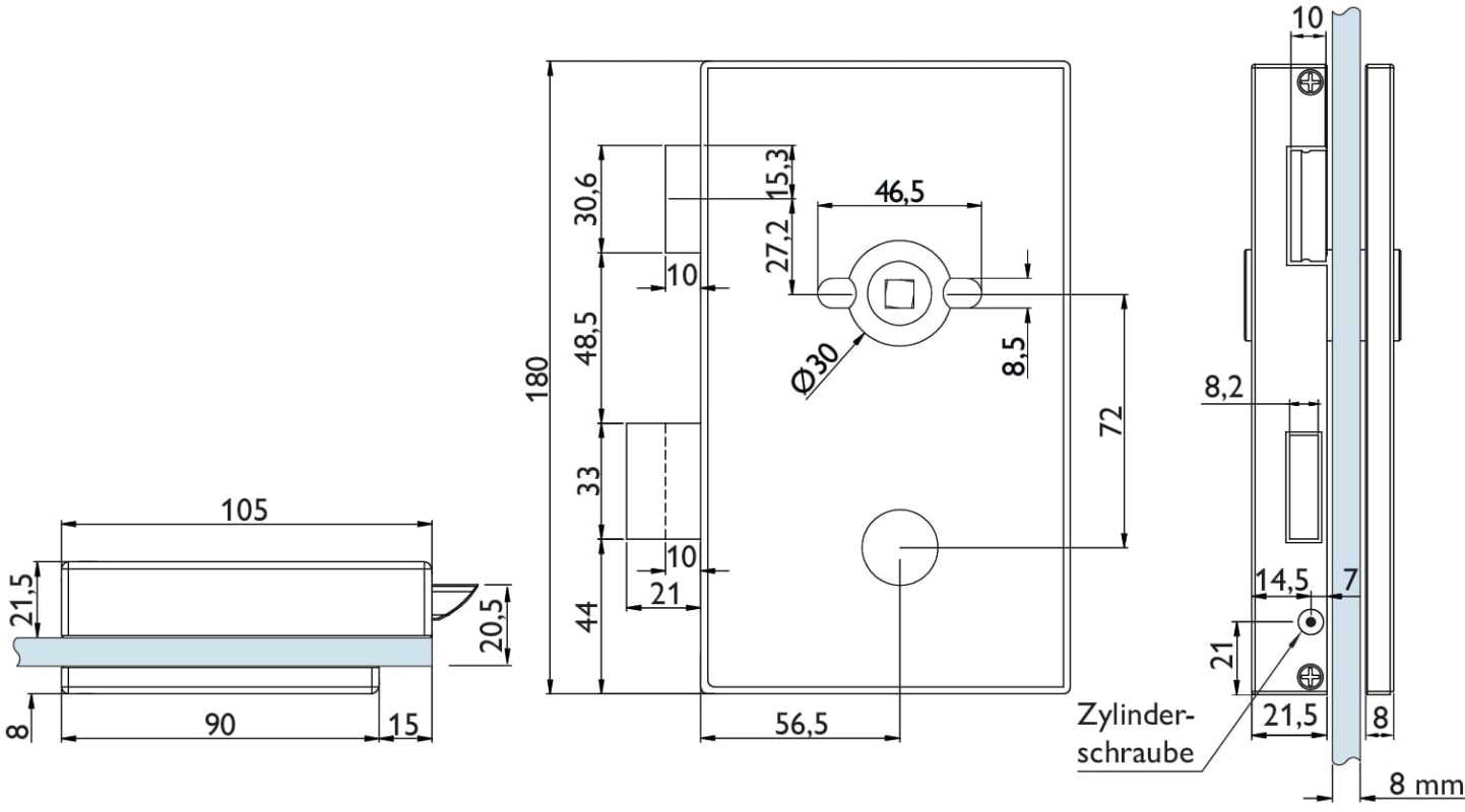 Glastür-Schlosskasten 6058-R RZ - Molina, RZ 22 mm gelocht - DIN links, vorgerichtet für Drückerrosetten, Oberfl. 60 (Edelstahl matt)