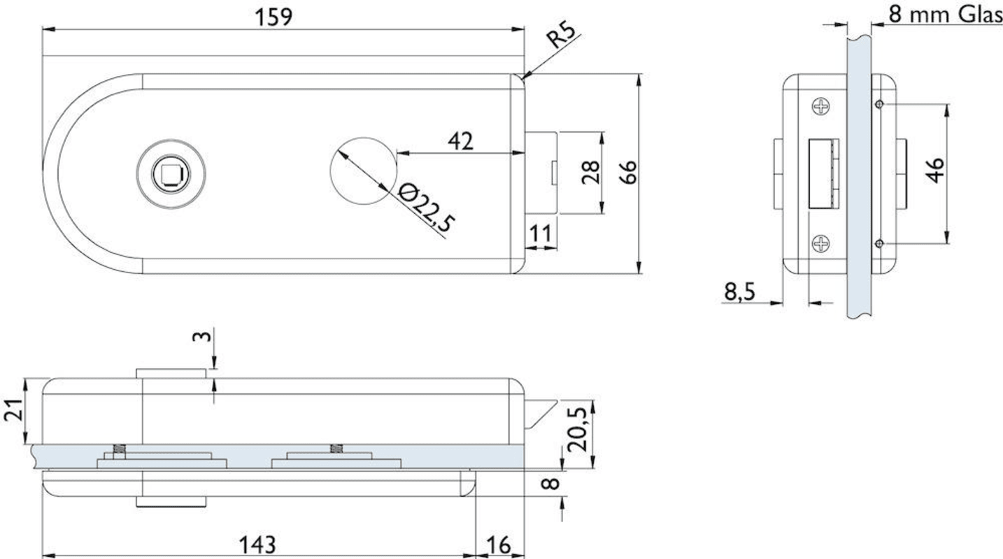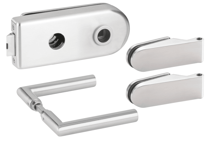 Glastür-Schlosskasten 6018 RZ - Venezia, Rundzylinder-Lochung Ø=22 mm, inkl. Bandpaar 6215, und Drückerpaar 1802-60, Oberfl. 60 (Edelstahl matt)
