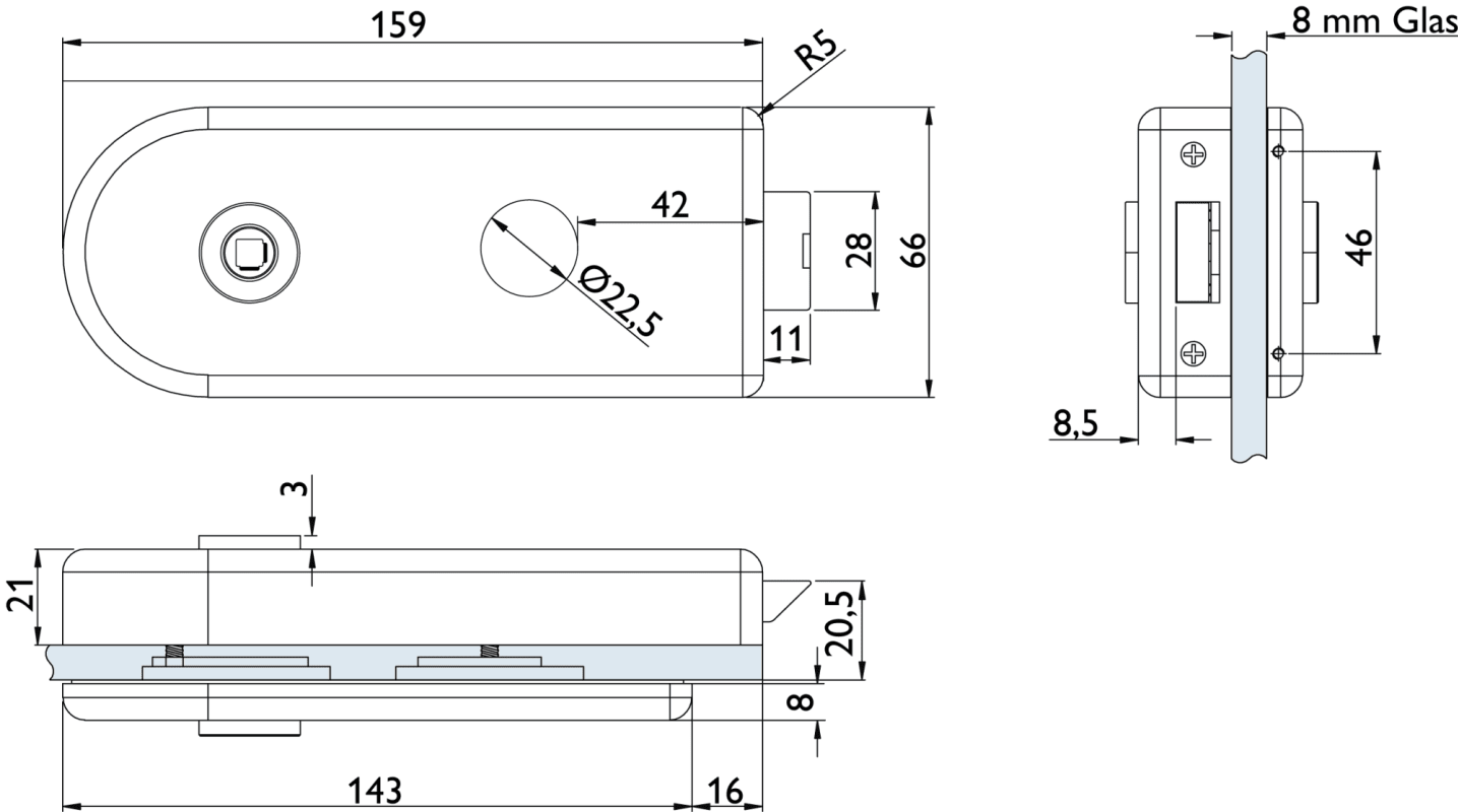 Glastür-Schlosskasten 6018 RZ - Venezia, Rundzylinder-Lochung Ø=22 mm, inkl. Bandpaar 6315 & Rahment. Holzzarge, Oberfl. 60 (Edelstahl matt)