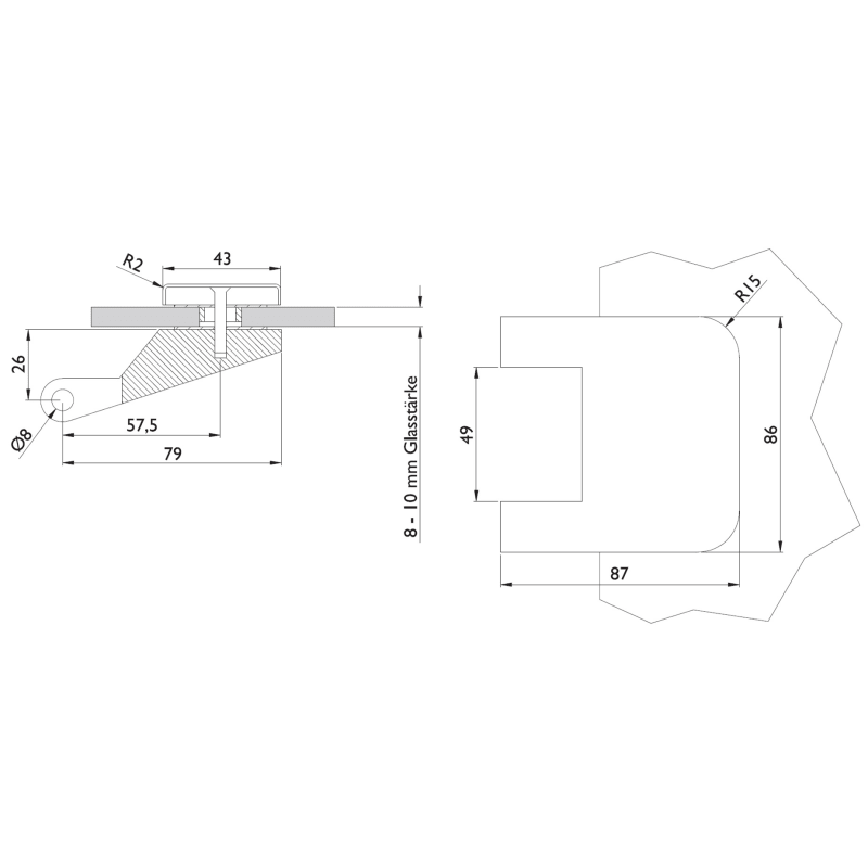 Glastür-Bandpaar 6315. Technische Daten: • 3 tlg. (Officebohrung) ohne Rahmenteile • max. empfohlene Türbreite 1000 mm Lieferumfang: Glastür-Bandpaar 6315, inkl. Hülsen für Rahmenteile