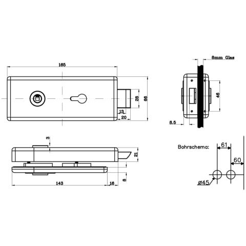 Glastür-Schlosskasten 6083 PZ - Genova, PZ gelocht, Oberfl. F1 (silberfarben eloxiert)