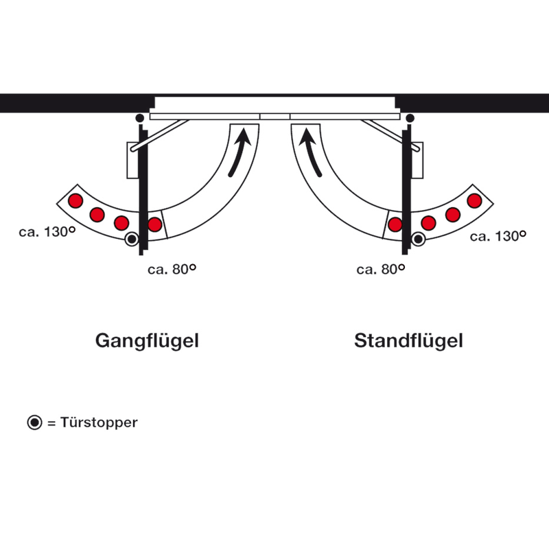 Gleitschiene mit integrierter, mechanischer Schließfolgeregelung, geprüft nach EN 1158. Elektromechanische Feststellung im Gang- und Standflügel, geprüft nach EN 1155. Feststellpunkt (80° – 130°) und