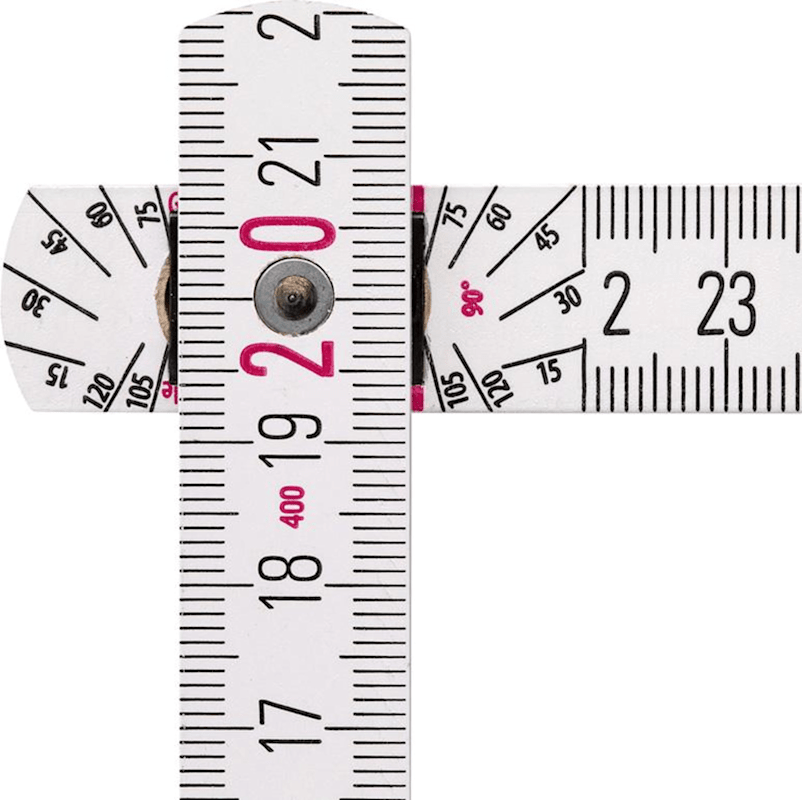 Holz-Gliedermaßstab Type 140 • Buchenhol • Widerstandsfähige, witterungsbeständige Lackierung zum Schutz der Holzlättchen und der Skal • Schwarz aufgedruckte Maßeinteilung mit roten Zehnerzahle • mm-/cm-Teilun • Eingelassene, gehärtete Stahlblechgelenk • Durch die eingelassenen Gelenke entsteht im ausgeklappten Zustand eine durchgehend gerade Kante, der Maßstab ist so auch als Lineal für eine durchgezogene Anreißlinie zu verwende • Winkeleinteilung in der Gelenkverbindung des ersten Maßstabgliedes • PEFC-zertifizier • EG-Baumusterprüfbescheinigun • EG-Genauigkeitsklasse III