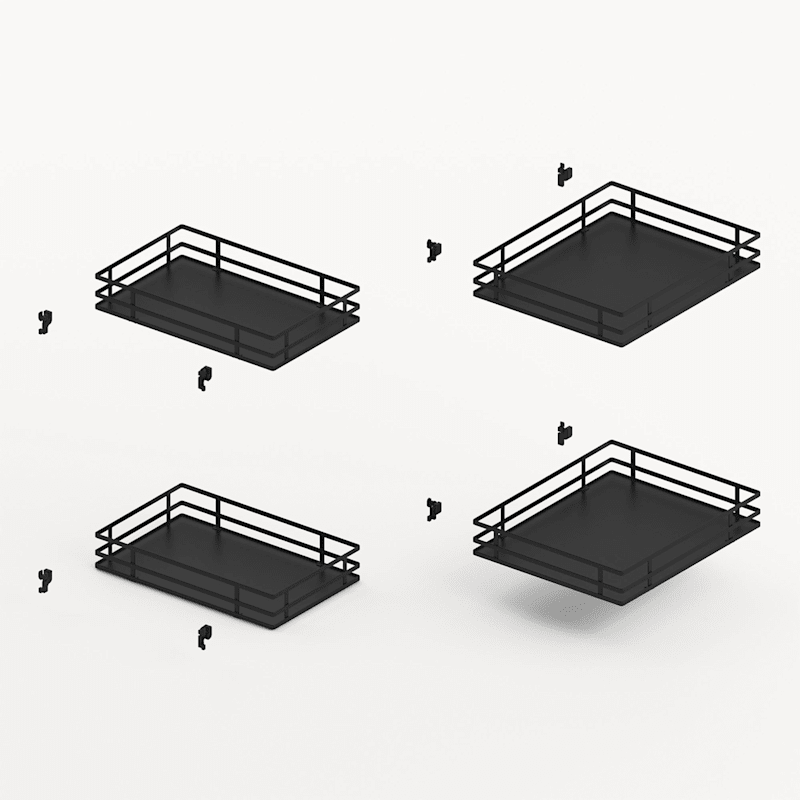 • Einhängetablare für Tragrahmen Goro• Belastbarkeit: 7 kg je vorderes Tablar, 9 kg je hinteres Tablar• HDF Boden (5 mm) weiss bzw. anthrazit• Flachdraht-Reling StahlSet besteht aus:• 2 Stück Einh