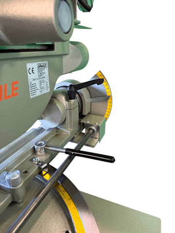 • Hierbei kann die Maschine über eine verlängerte Kurbel von vorne unterhalb des Materialauflagetisches geneigt werden.
